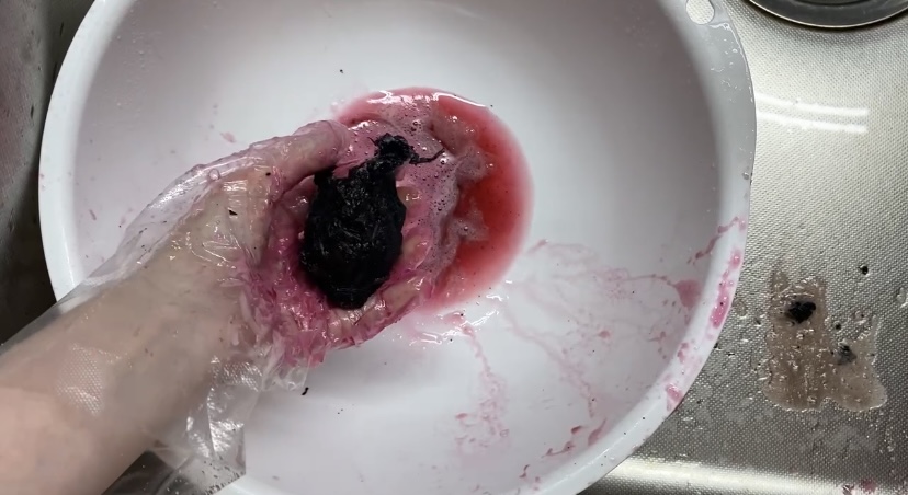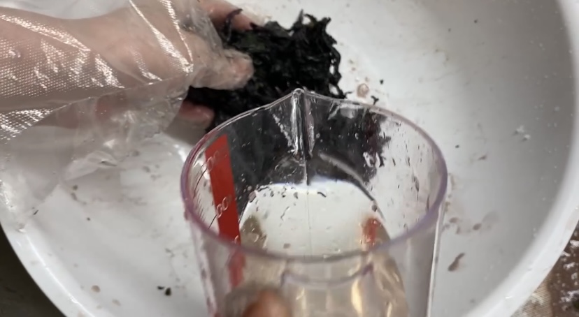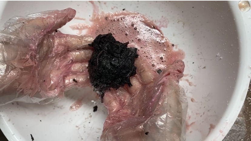 泡だった黒っぽい汁から、だんだん赤い液へ変わっていき・・・