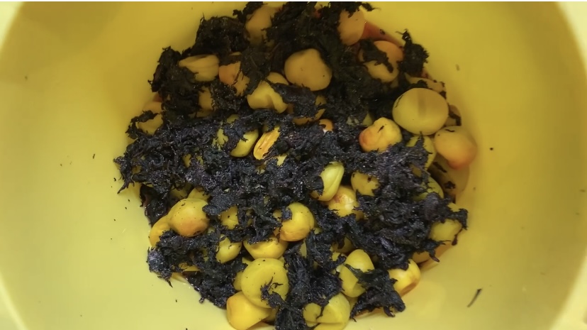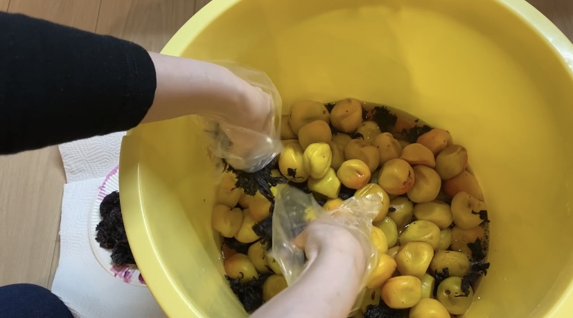 塩をかけて揉むと、浸透圧で水分が出て葉が小さくなります。出てきた黒っぽい汁が、アクです!
