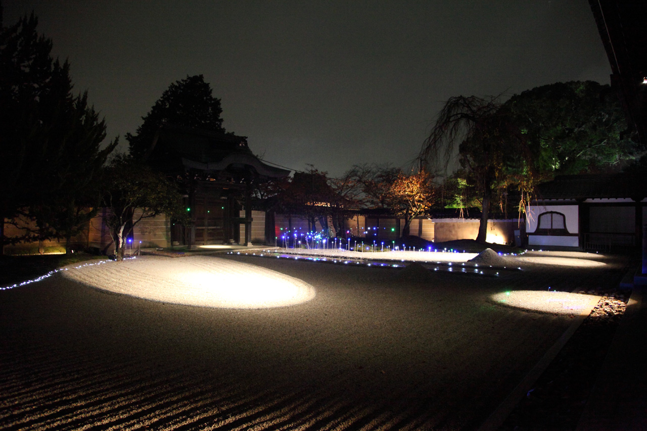 枯山水?のお庭に、地元の芸術大学の方がイルミネーションを施している図です。