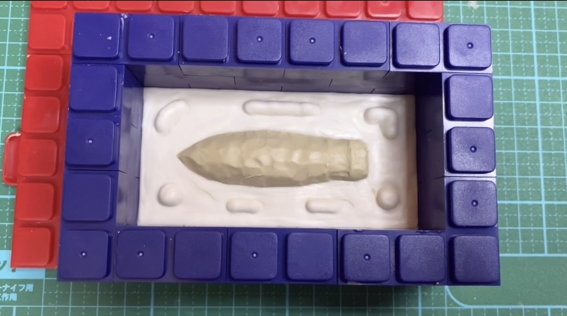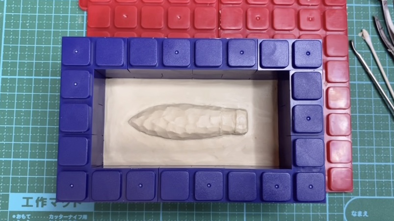 まずは片面を型取り。プロックプレートを敷き、油粘土を敷いて原型を埋め、型取りブロックで囲みます。