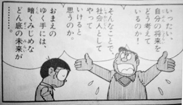 ダメなやつの代名詞であるのび太から人生について学んだことは癪ではあるが、僕以外にものび太から色々と学ぶべき人々は沢山いると思う。やがて勝ち組となるであろうのび太の生き方を見ていると、大らかに、前向きに、自分を見失うことなく、淡々と生きていく事が大切だと思うし、親や友だち、ひいては社会に受け入れられているという実感もとても大切なことだと思った。