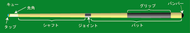 ショットを繰り出す重要な道具ですね。正しくはキュー(Cue)と呼びます。「棒」とか「撞き棒」とか言うとカッコ悪いのでちゃんとキューと呼びましょう。各部の名称は上記のとおりですが、プレー用の他にジャンプ用、ブレイク用のキューを用意することが多いですね。ちなみに自分のキューがなくてもお店でレンタルしてもらえます。レンタル料は特別な場合を除いてゲーム代に含まれています。