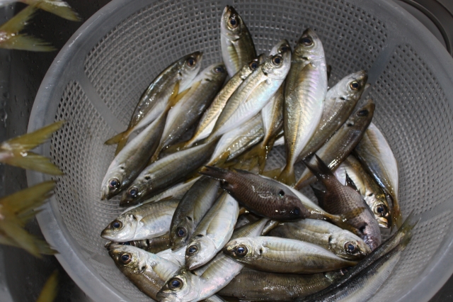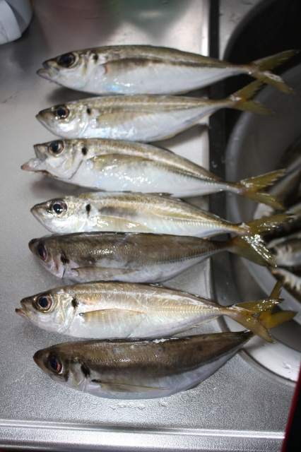夜明けから釣り始めて釣果はこの通りやや大きめから中型、小型のアジが釣れました。