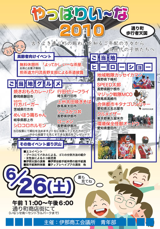 地元伊那市のローメンとソースかつ丼に加えて静岡、群馬、埼玉、茨城、岐阜の御当地グルメもあるそうです。天気が心配ですが、とにかく雨天決行だそうですので、これを御覧の方々で来れそうな方々はぜひ入らして下さい。