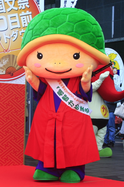 | 2011年に亀岡市の丹波亀山城が築城400年を迎えるにあたり誕生したマスコットキャラクター。 天正元年(1572年)10月23日生まれ。丹波亀山城のお堀に光秀公の娘「玉子」が誤って落ちて溺れたところを堀に住んでいた亀が助けました。光秀公はたいそう感謝しその亀を「明智かめまる」と名づけてとても可愛がりました。 人間の年齢にすると7歳くらいらしい 住所:京都府亀岡市南郷池(亀山城跡) 性別:男の子 特徴:亀の甲羅を兜に日々武道に励み、丹羽・亀山城跡を守っている。 最近の楽しみ:湯の花温泉でくつろぎ…トロッコ列車を楽しみ…保津川下りを満喫することが最高! 名前は城主の明智氏にちなんでいます。2010年3月13日の嵯峨野山陰線複線化完成イベントで着ぐるみのお披露目がありました。 |