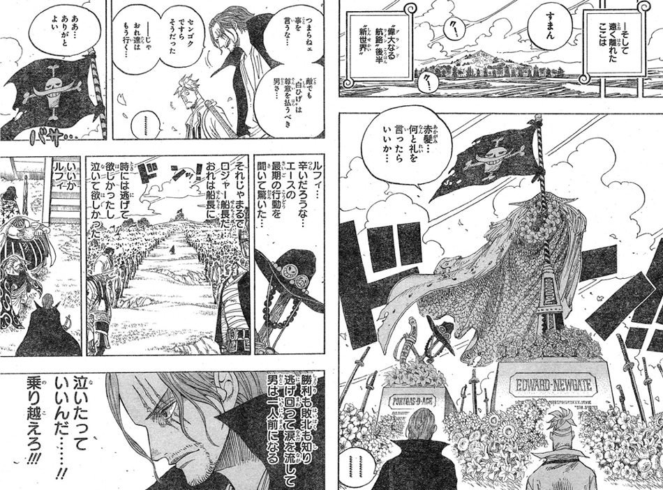 遠く離れた偉大なる航路後半 新世界で、白ひげエドワード・ニューゲート、火拳ポートガス・D・エースの墓前でシャンクスの感謝を述べるマルコ!シャンクスもルフィを想います!『勝利も敗北も知り逃げ回って涙を流して男は一人前になる 泣いたっていいんだ・・・!!乗り越えろ!!!』