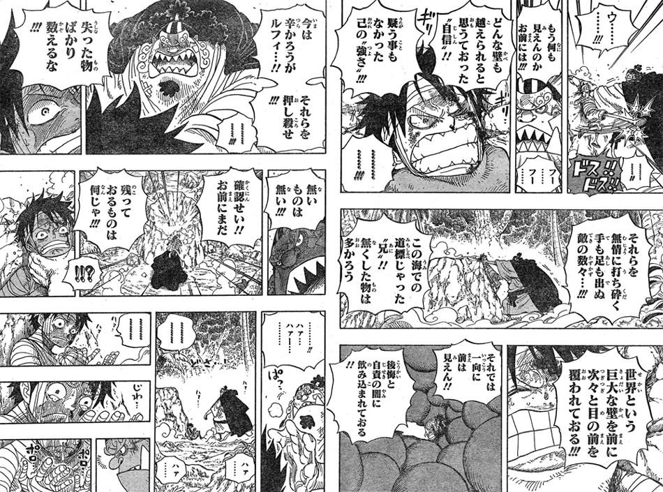 “凪の帯”女ヶ島では、自分は弱いと苦しむルフィ!!ジンベエがルフィを気にかけますが、ルフィはジンベエに刃を向けパンチ!しかし傷だらけのルフィはジンベエに倒されてしまいます!ジンベエは、エースがルフィに3年振りに一目会って安心したと話していたのを思い出しています。ジンベエに噛み付くルフィ!ジンベエはルフィを抑え付け強く訴えかけます!!まだ残っているものは何かと聞かれ、仲間の存在を思い出すルフィ!!