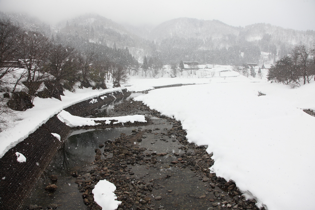 駐車場からこの川を渡って白川郷へ入っていきます。
