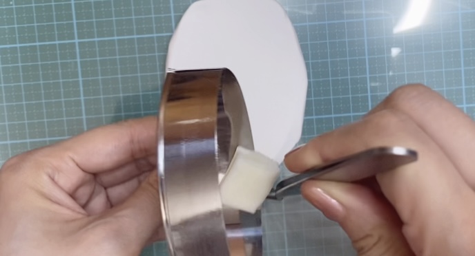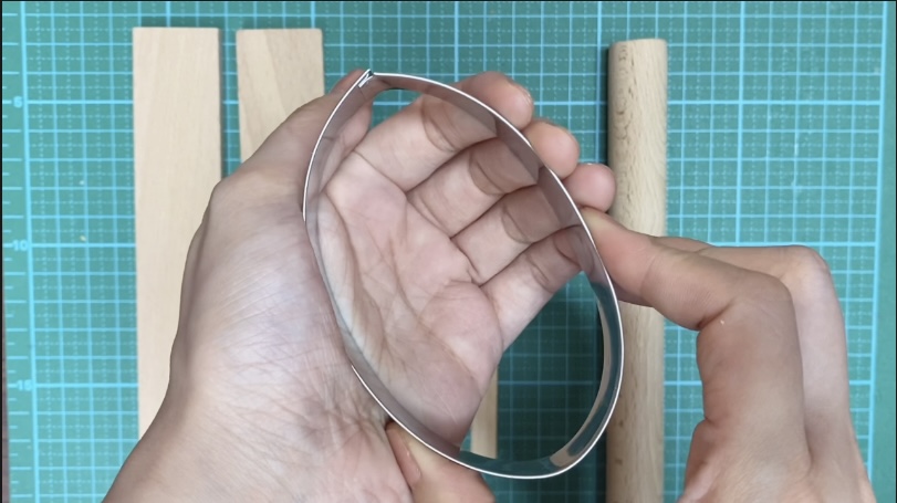百均のセルクル型(製菓用)を、丸から楕円形にします。少し押すだけで、簡単にぐにゃっと曲がるので便利!