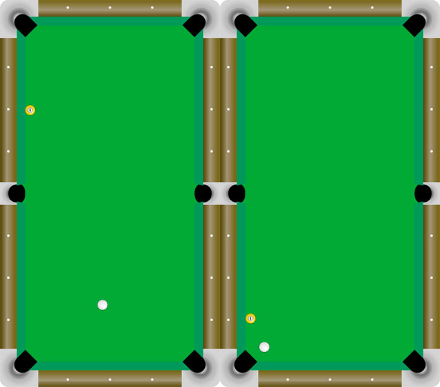 ちなみに先球をポケットする際にはヒネリは極力使わないようにすると良いと前回のネタで書きましたが、クッションタッチに関して言えば若干ヒネリを加えるとさらにポケットの率が上がります。上記の例ではほんの少し右上を撞くと格段にポケットしやすくなるはずです。もちろん真ん中の撞点でもポケットは可能です。