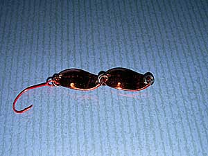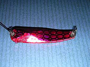| ウォーターランド社「ロングゲーター」に鱗シールを貼り付け、模型用のクリアーレッドを塗り、クリア塗料を塗ってあります(防水性)。ロングゲーターは釣り場でも良く見受けられる有名どころのルアーですが、鱗で蛇をイメージし、集魚性の高い「いくら色」で塗装してあります。 | |