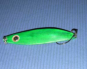 | メーカ不肖の大型スプーンです(10g)後で説明するアルミ箔を張り込み、緑色で塗装。その後写真3の目玉シールを貼り付け、バッタをイメージしてみました。まだ釣れたことはありませんが(主にイトウ狙い)効果が期待できるチューニングの一つです。 |