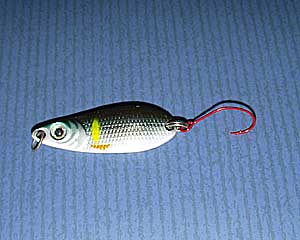 | ベースはメガバス社の「スプーンX」ボディ部分は完璧にノーマルですが、針が赤い色に交換してあります。赤い針は場所によっては禁止されているので注意が必要です。赤い針は赤虫に似ているということもあり、釣果が向上します。 | |