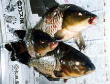 55センチを頭に 60センチ級の鯉 | 59センチの大型ニジマスと 釣り人K | 55センチの鯉、 ファントムにヒット |