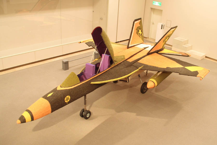 | フィロズ・マハムド(Firoz Mahmud) 1974年クルナ(バングラデシュ)生まれ/東京都及びニューヨーク在住 『Sucker’ wfp21』 戦闘機の形を模したものですが、なんと表面は豆などの穀物で覆われています。全く違ったイメージのもので作られた戦闘機はなんだか戦闘機らしからぬ雰囲気を持っていました。ちょっと美味しそうにも見えましたよ。 | |