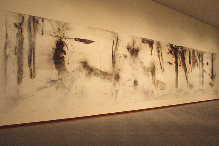 | 蔡國強(Cai Guo Qiang) 1957年泉州市(中国)生まれ/ニューヨーク在住 『美人魚』 まにあ道スタッフが制作現場にお邪魔した作品。大迫力の爆発の末に出来上がった作品です。火薬という危険な材料を用いた作品とは思えない優雅なイメージの作品ですね。 下書きの際に水槽に泳ぐ熱帯魚と女性をモチーフに描いていましたが、その映像も会場で放映していました。 | |