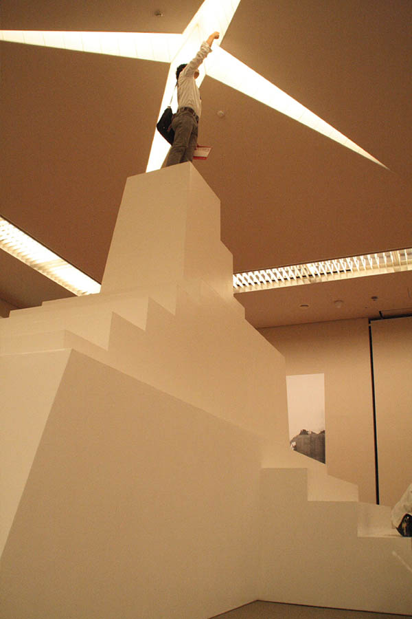 | アマリア・ピカ(Amalia Pica) 1978年ネウケン(アルゼンチン)生まれ/ロンドン在住 『フロム・スクエア・トゥ・スター』 触われる、さらに乗れる作品でしたので何事も経験と思い乗ってみました。高さ4mほどでしょうか、頂点は狭いので少し恐かったですが、星形に切り込まれ光る天井に触れている時は恐さを忘れていました。でも下りる時は初めの一歩が出にくかったです。 | |