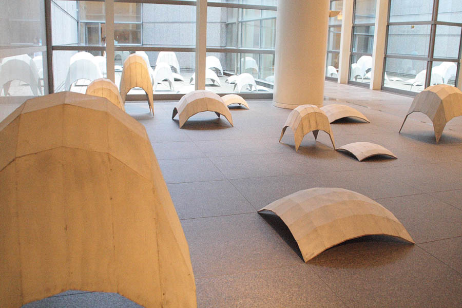 | エクトール・サモラ(Hector Zamora(eにアクセント記号)) 1974年メキシコシティ生まれ/サンパウロ在住 『摂社』 同じ系統の形をしたオブジェが所狭しと中庭の空間にまで飛び出て展示されていました。これは懸垂曲線をめぐるオブジェだそうで、コンクリート製とのことです。コンクリートなのに軽そうに見える不思議なオブジェでした。 | |