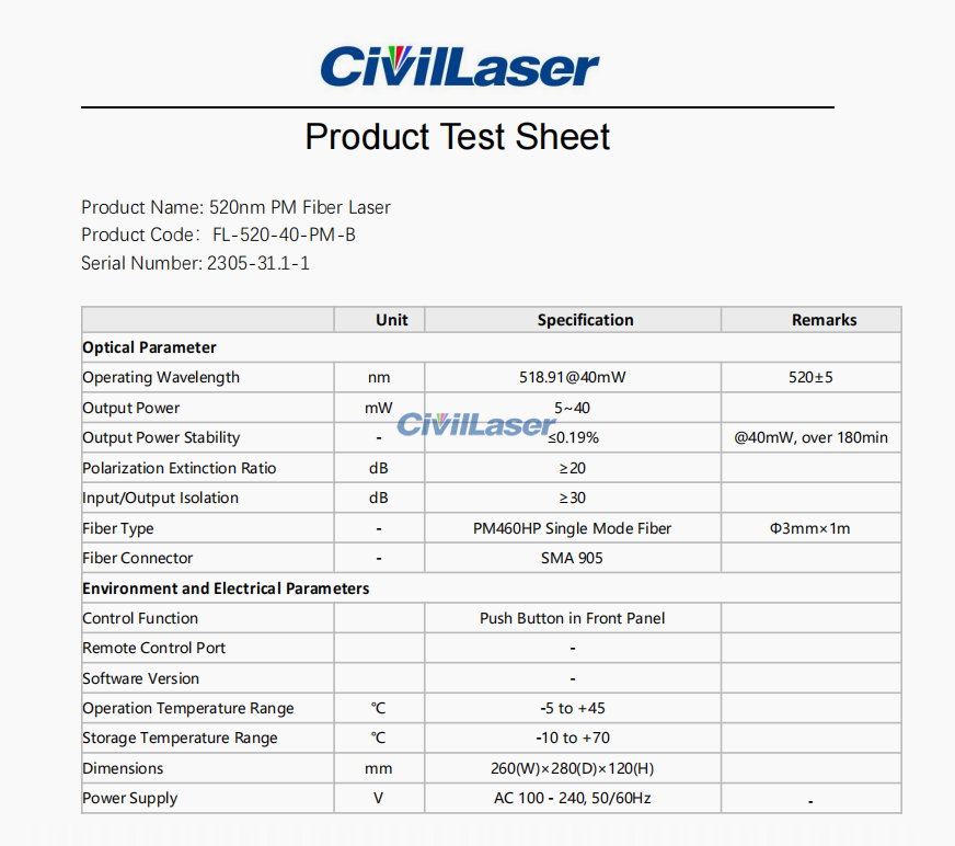 520nm 40mW PM ファイバーレーザー 高品質レーザースポット