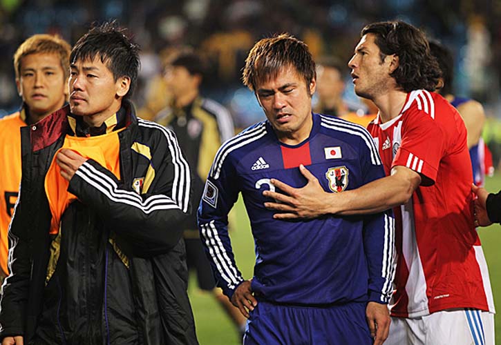 PKを外し 涙を流す駒野に両脇で支える松井と阿部