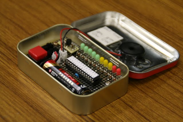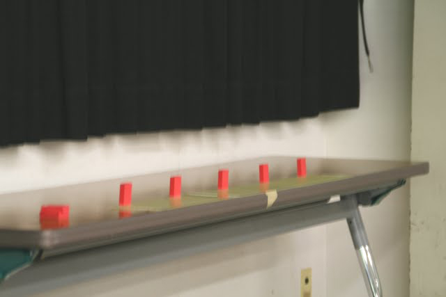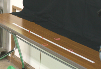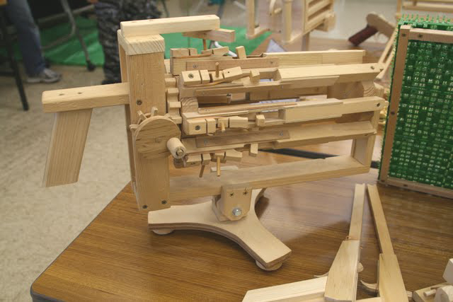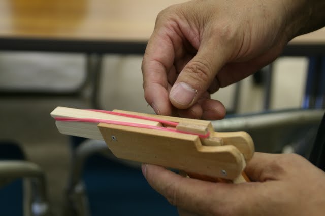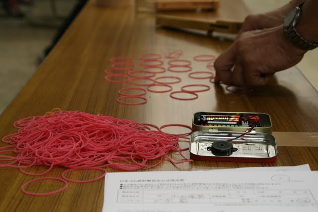 大量のゴムとタイム計測のスイッチ。このようにゴムを引っ掛けて撃つしかけになっています。※写真は連射銃