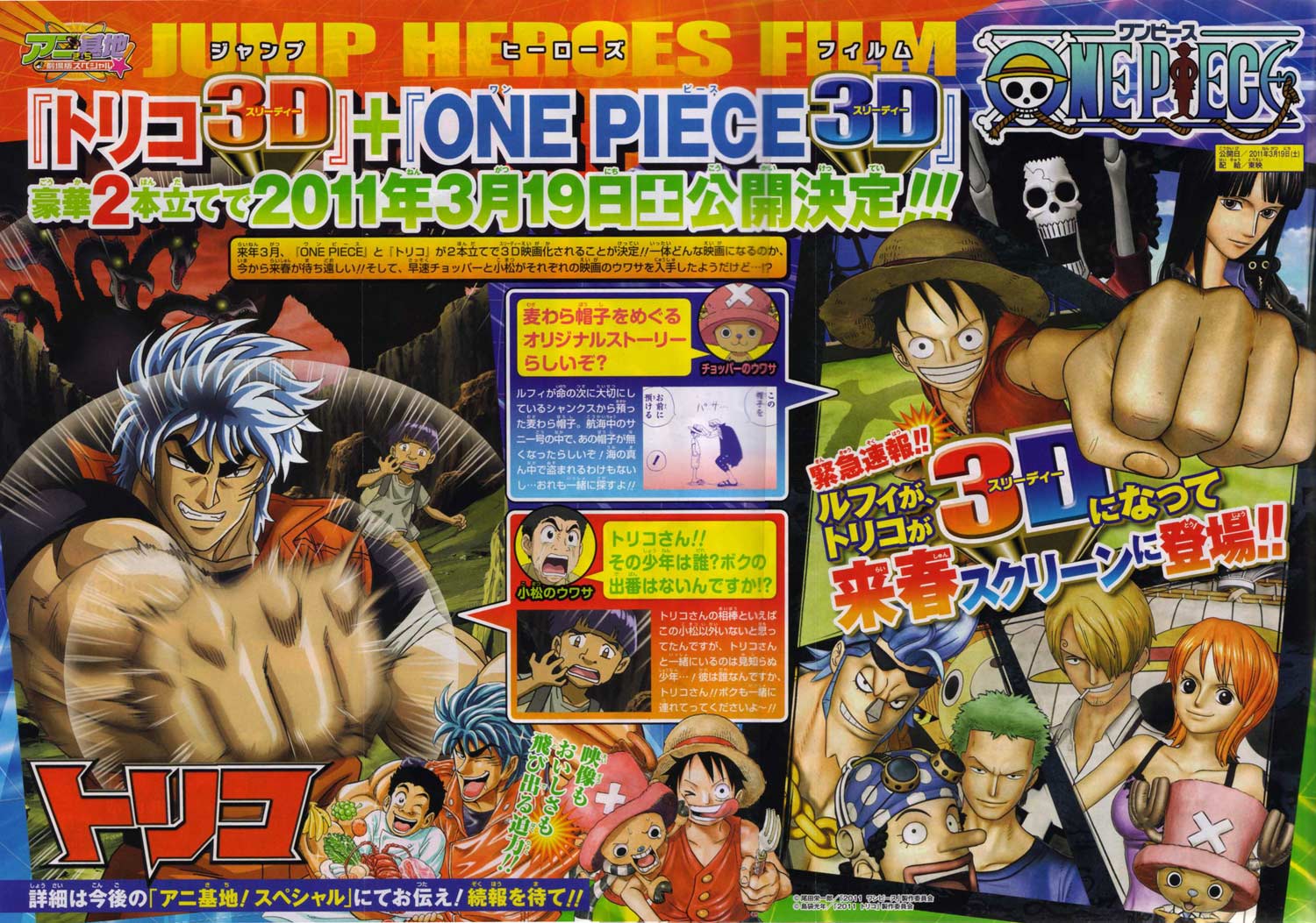 大人気漫画「ONE PIECE」の劇場版シリーズ最新作が、3D映画で登場することが3日、分かった。来年3月19日公開の映画「ジャンプ HEROES FILM」として、「週刊少年ジャンプ」(集英社)でともに連載中の「トリコ」と同時上映される。