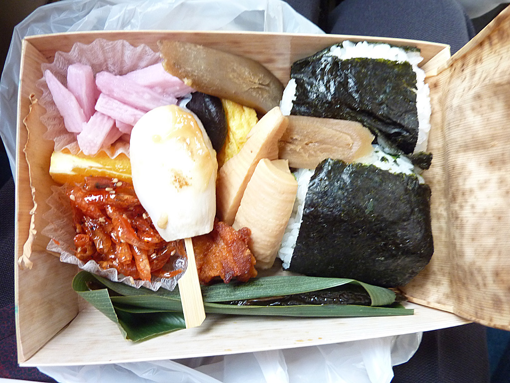 で、妙にご飯(おむすび)が大きいです。SLの「ポー」って音を耳に