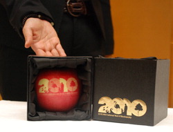 記者会見後、フォードさんは「2010」と表面に描かれたリンゴを生物多様性条約事務局から受け取り、笑顔を見せた。このリンゴは、青森県弘前市のリンゴ袋製造販売会社「佐藤袋店」が作った「絵入りリンゴ」で、同社製の特殊なシールを市内産「むつ」に張って日光で色付きを調整し、文字と会議のロゴを表面に浮かび上がらせた。