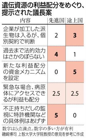 途上国が主張していた利益配分の対象を議定書発効以前や植民地時代にさかのぼることは盛り込まれなかったが、代替措置として途上国に多国間で資金支援する枠組みを設ける。遺伝資源を加工した「派生物」は事実上、議定書の利益配分の対象から除外された。ウイルスなどの病原体についてはワクチン開発のための先進国の早急な利用を認め、適切な利益配分を求めた。
