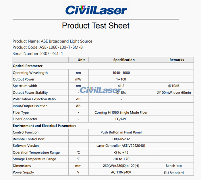 この ASE 広帯域光源のテスト データレポートとスペクトログラム。