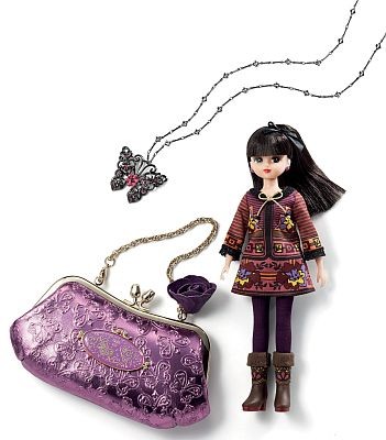 これは、「ANNA SUI FALLコレクション2010」のメインドレスを着たリカちゃんと、同ブランドの人気アイテムをセットにしたもの。デザイナーのアナ・スイ自身をイメージしたというストレートロングの黒髪と真っ赤なリップの「リカちゃん」に、「ANNA SUI」の定番モチーフである蝶にピンクのカットガラスをあしらったメタル製のネックレスや、表面に蝶を型押してメタリック加工を施したバラのチャーム付きポーチが付いた特別限定商品だ。