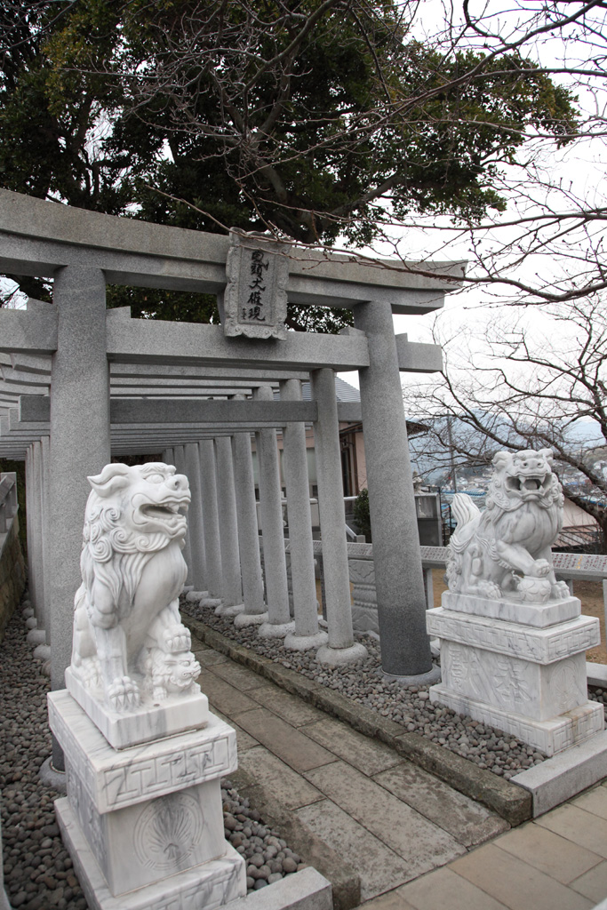 獅子が鳥居の前に2匹います。どちらが雄雌ってわかりますか?