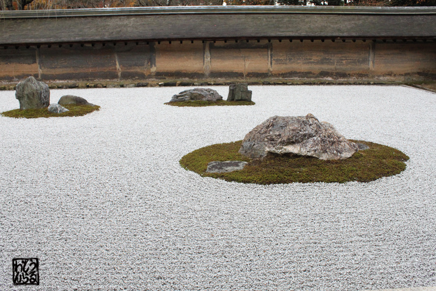 龍安寺の石庭(方丈庭園)です。枯山水の傑作です。高校の歴史の教科書等にも載ってます。