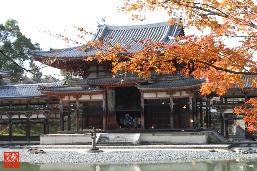 宇治の平等院鳳凰堂です。十円玉のアレです。風に舞い散る紅葉は雅です。