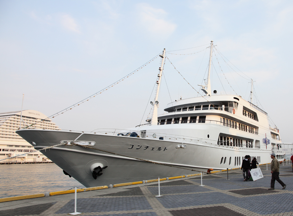 初回は、神戸港の名物客船「コンチェルト」の外観です。
