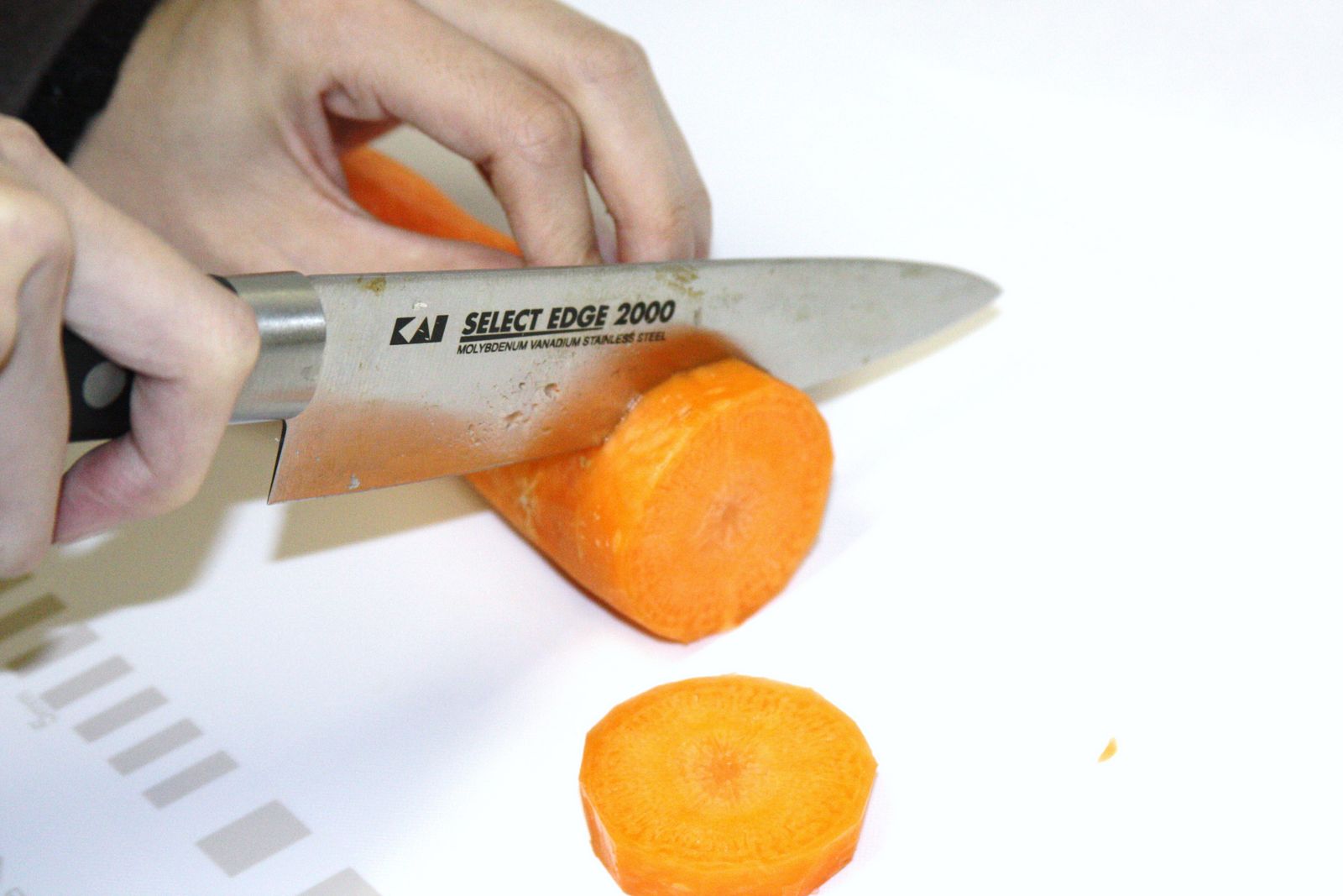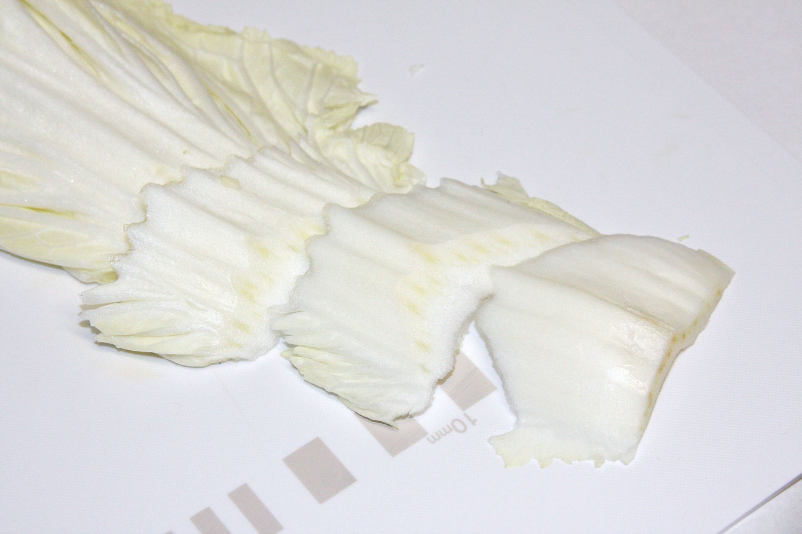 包丁を少し寝かせ、厚みを薄く「そぐ」様にして切る。白菜の芯の部分や白身魚によく使います。