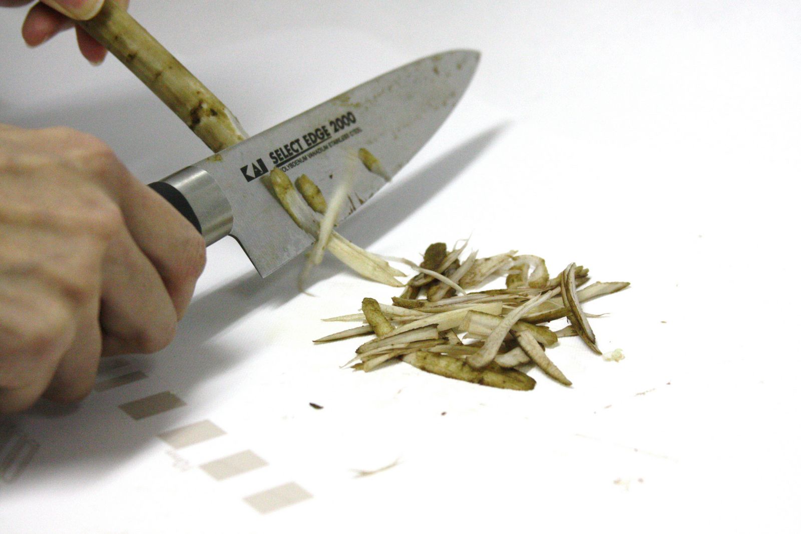包丁の刃先を使い、縦に細かく切れ目を入れ、ごぼうの先をまな板につけ、鉛筆を削る要領でそぐ。