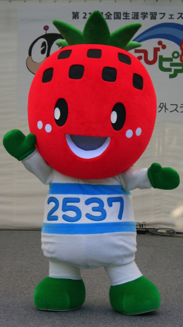 | 1月15日(いーいちごの日)に吉見百穴ひかりごけの穴で生まれ荒川の水でスクスク育った妖精。 胸の数字は吉見町内で最も広くなっている荒川の川幅を表している。 |