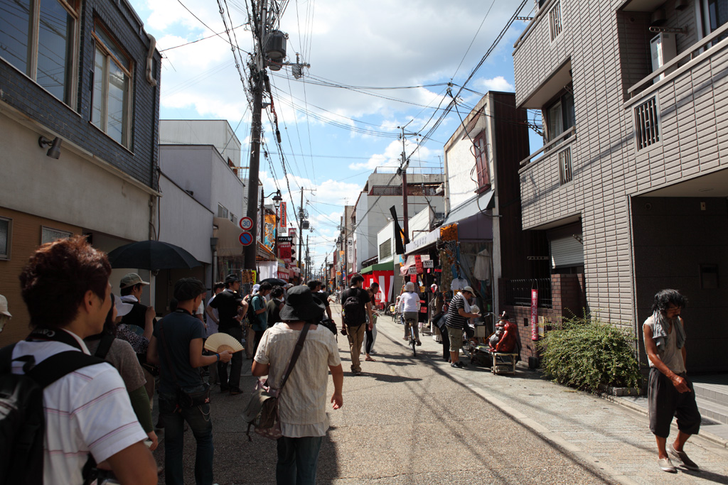 商店街のお店の前に、妖怪の置物が置いてあり、それぞれの店で