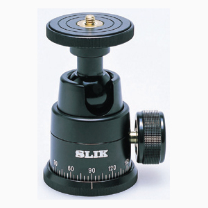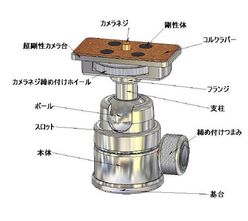 といいます。雲台本体にボールが入っており、ぐるぐると回ります。横のネジで締め込みを行い、被写体に合わせます。特徴として、素早い構図の確定ができるのと、雲台自体が軽量なので機動性に優れています。反面、重量級の機材には重さが耐えれないのと、締め込んだ後にに若干の緩みがでる場合があり、長時間の撮影には向きません。写真は平行を確認できる平衡水準器装備機(下部写真も自由雲台)