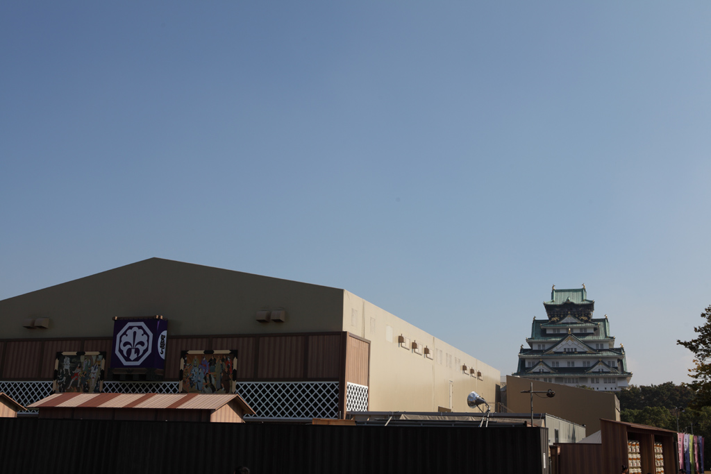 画面左の体育館が「平成中村座」です。最後は舞台の奥が開き、桜が天井から舞って来ます。そしてその奥に大阪城がみえるという凝った趣向です。