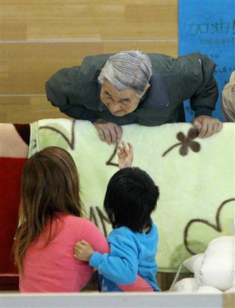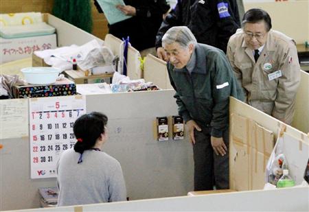 天皇、皇后両陛下が2011年5月11日、福島市と福島第1原発から半径45km圏内の相馬市に入り、津波で被災した地域を視察された。
