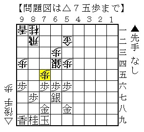 受けの問題です。 今、後手が棒銀戦法で △7五歩と突いて銀を進出しようとしています。 この手に対しては手筋の受けがちゃぁーんとあります。 さて、銀の進出を止める一手は何でしょうか? α~ (ー.ー") ンーー