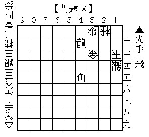 さて、3手詰めです。 平凡な攻めでは上部に逃げられて、 詰みにくそうですよね。 さぁーて、急所の一手は? 初手を答えて下さい。