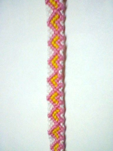 第一問 このミサンガの糸構成を答えよ(配点10点) ただし、このミサンガは次の構成であるとする。 主色:ピンク、イエロー 背景色:ホワイト (主色は必要最低本数) -公式群- (糸の本数)=(斜め一列の結び目の数)+1本 -ヒント- カッコ内を選択してください。本数が白で書いてあります。 (糸の本数は8本)