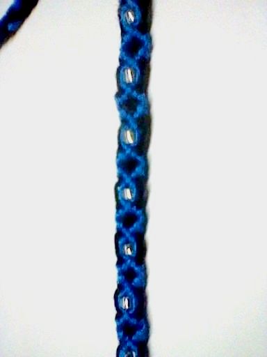第二問 このミサンガの糸構成を答えよ(配点5点) ただし、このミサンガは次の構成であるとする。 主色:ブルー 背景色:ブラック (主色は必要最低本数) -公式群- (糸の本数)=(斜め一列の結び目の数)+1本 -ヒント- カッコ内を選択してください。本数が白で書いてあります。 (糸の本数は6本)