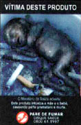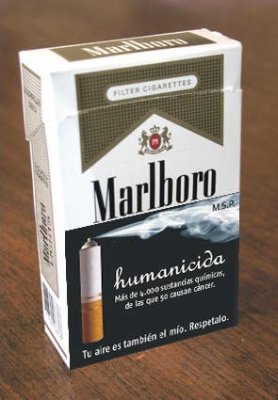 右は、ブラジルで売られているネズミとゴキブリの死骸写真と、「喫煙時あなたは砒素・ナフタリンなどネズミやゴキブリ用の駆除剤と同じものを吸入している」という警告表示が載っているパッケージ