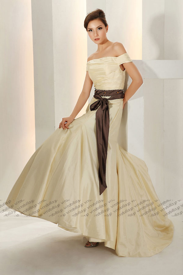 光沢のあるタフタを生かして、美しいシルエットを強調したスレンダーライン。オフショルダーを使って、初々しい花嫁を引き出す。すっきりとした上半身のデザインは、大人の雰囲気を求める花嫁にぴったりです。魅力的なオフショルダーのデサインで、可愛さを十分に創り出す。