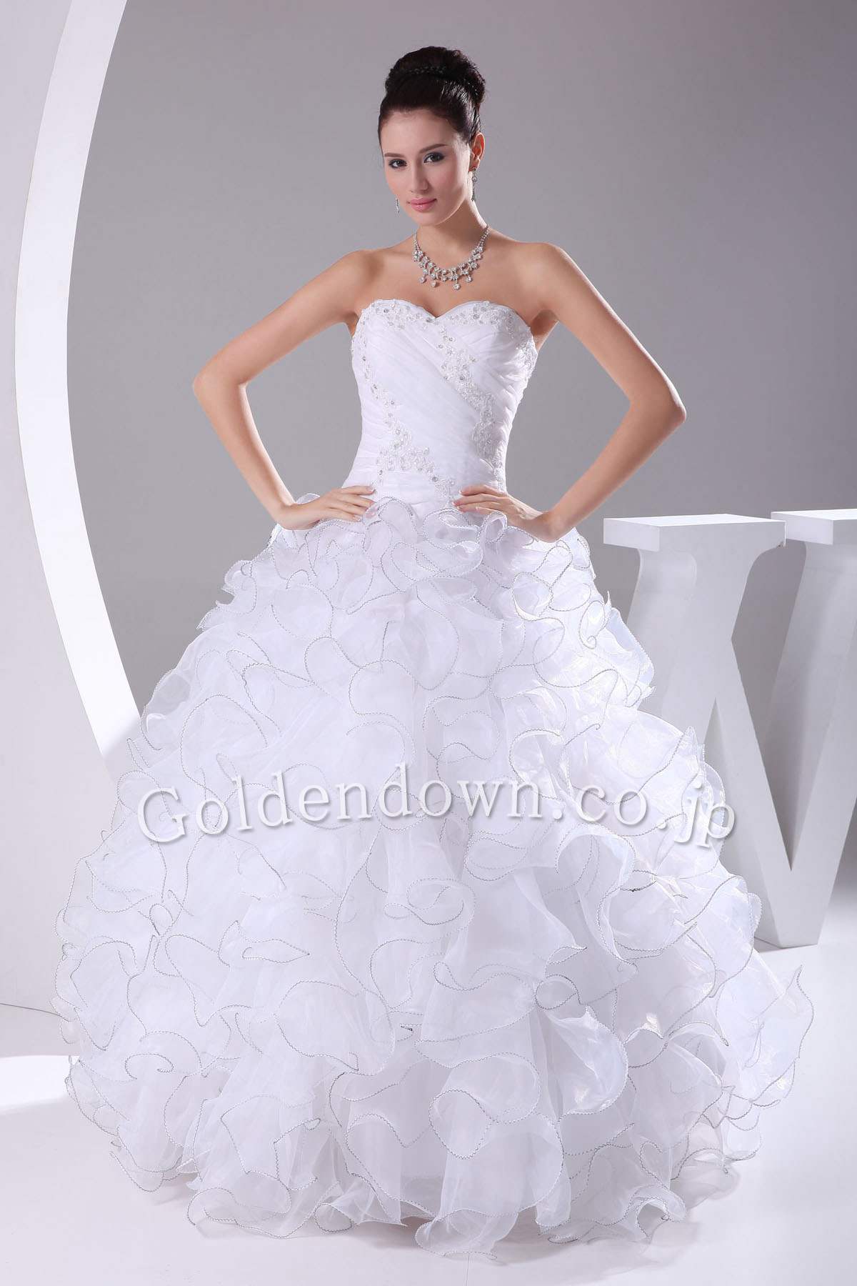 大きなフリルのカスケードでスカートに大きなボリュームを持たせたAラインです。http://www.goldendown.co.jp/uedeingudoresu/arain/uedeingudoresu-arain-huroa-hatokatuto-tiyuru-howaitowhite-wd1001010028